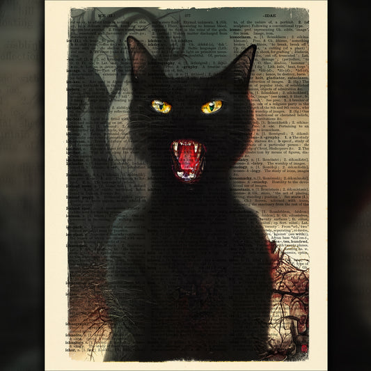 Screaming Black Cat Rocky - Limited Edition Print on Antique Vintage Dictionary Page