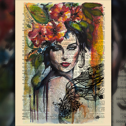 Rocky Predator in Petals - Limited Edition Print on Antique Vintage Dictionary Page