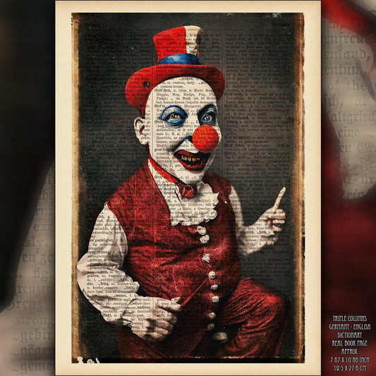Unsettling Clown - Victorian Gothic Art on Vintage Dictionary Page