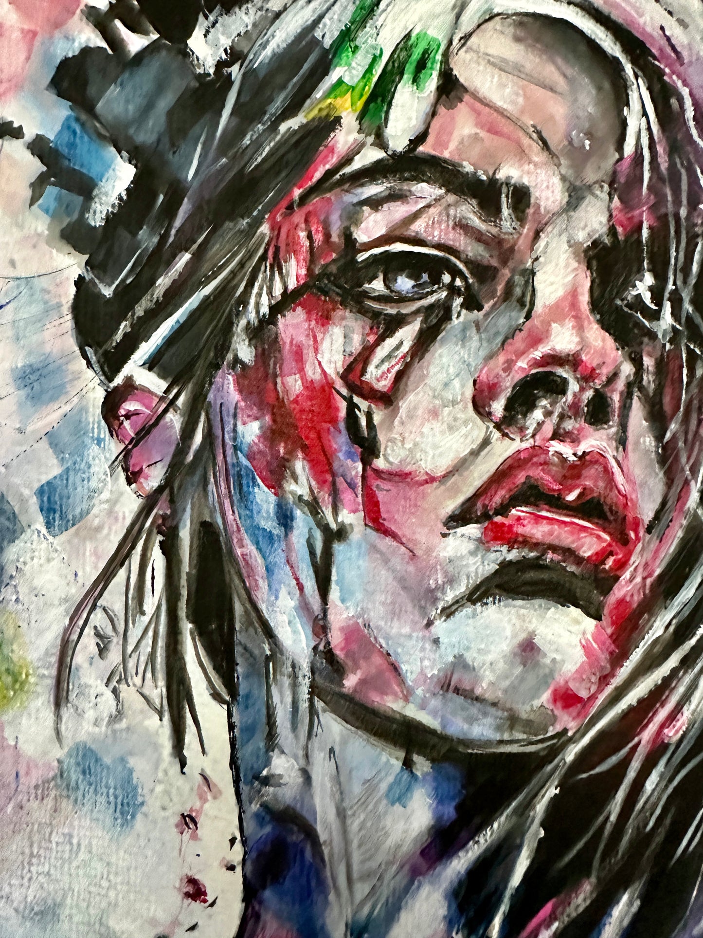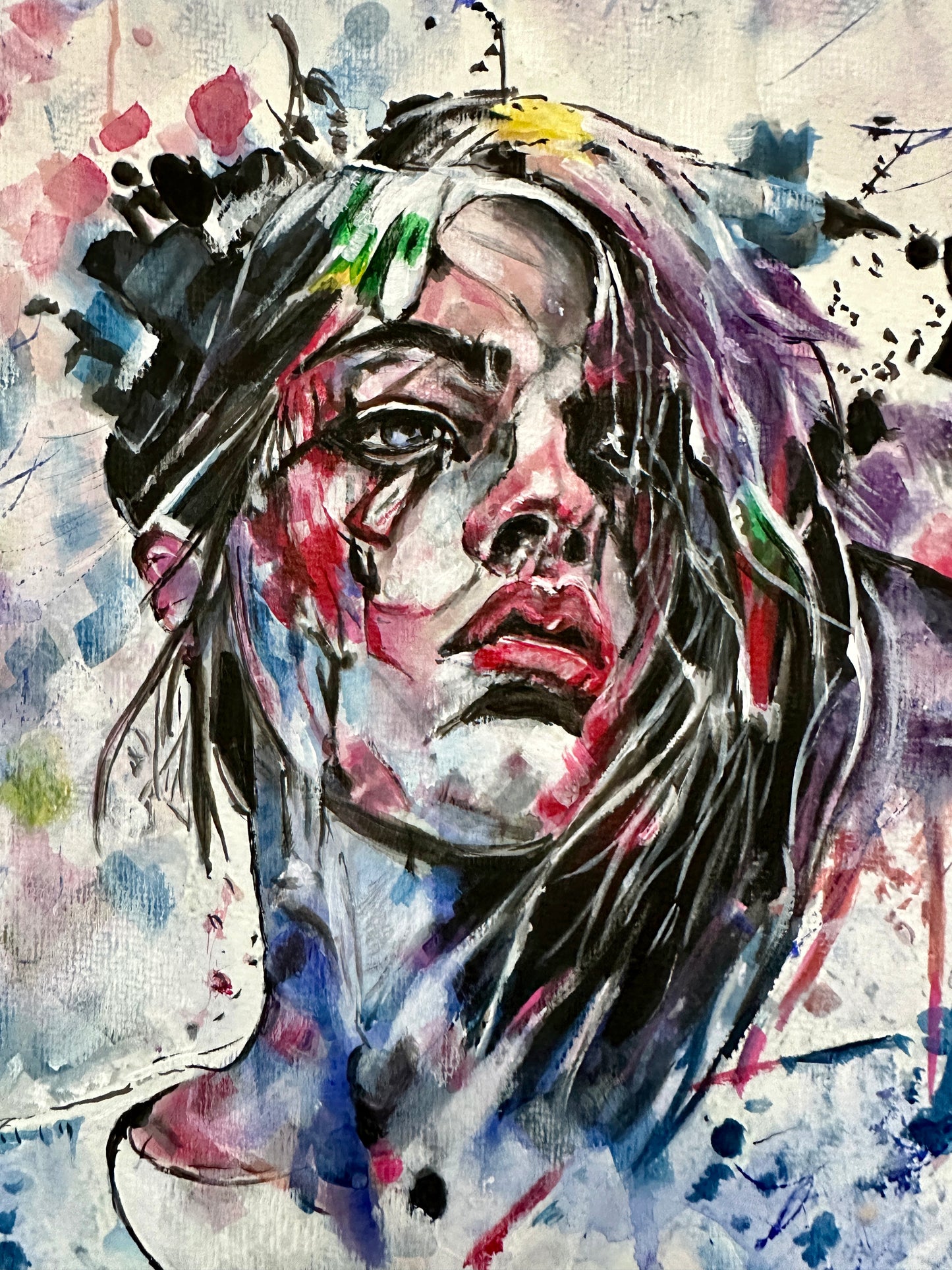 "Fluid Expressions" is an abstract portrait of a woman. In a captivating blend of blues, violets, and muted reds, the woman's face becomes a canvas of enchanting hues. The shades of blue lend a serene aura to her visage, while the violets add an air of intrigue. Amidst these captivating colours, the subdued reds offer a glimpse of restrained intensity, making her expression all the more captivating.