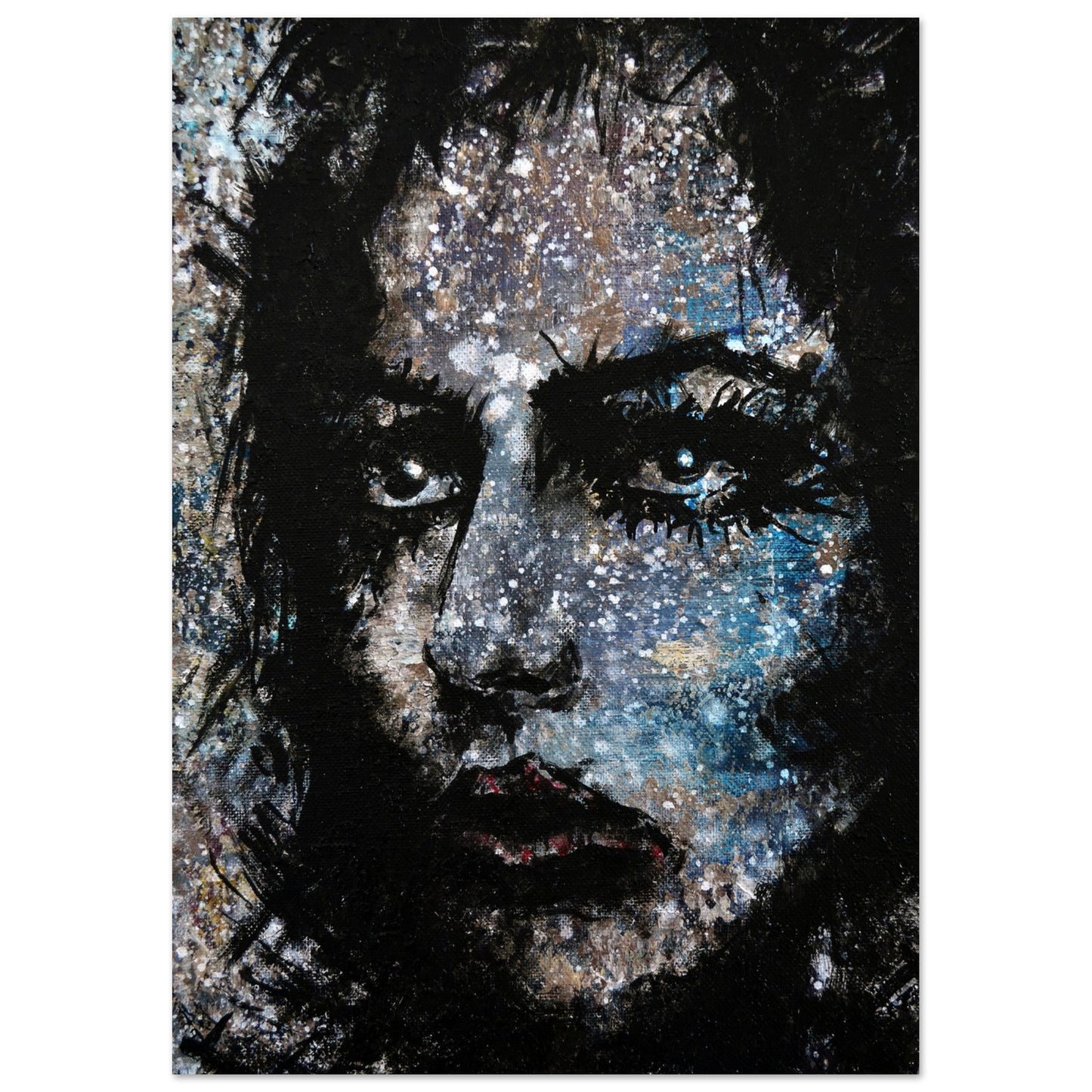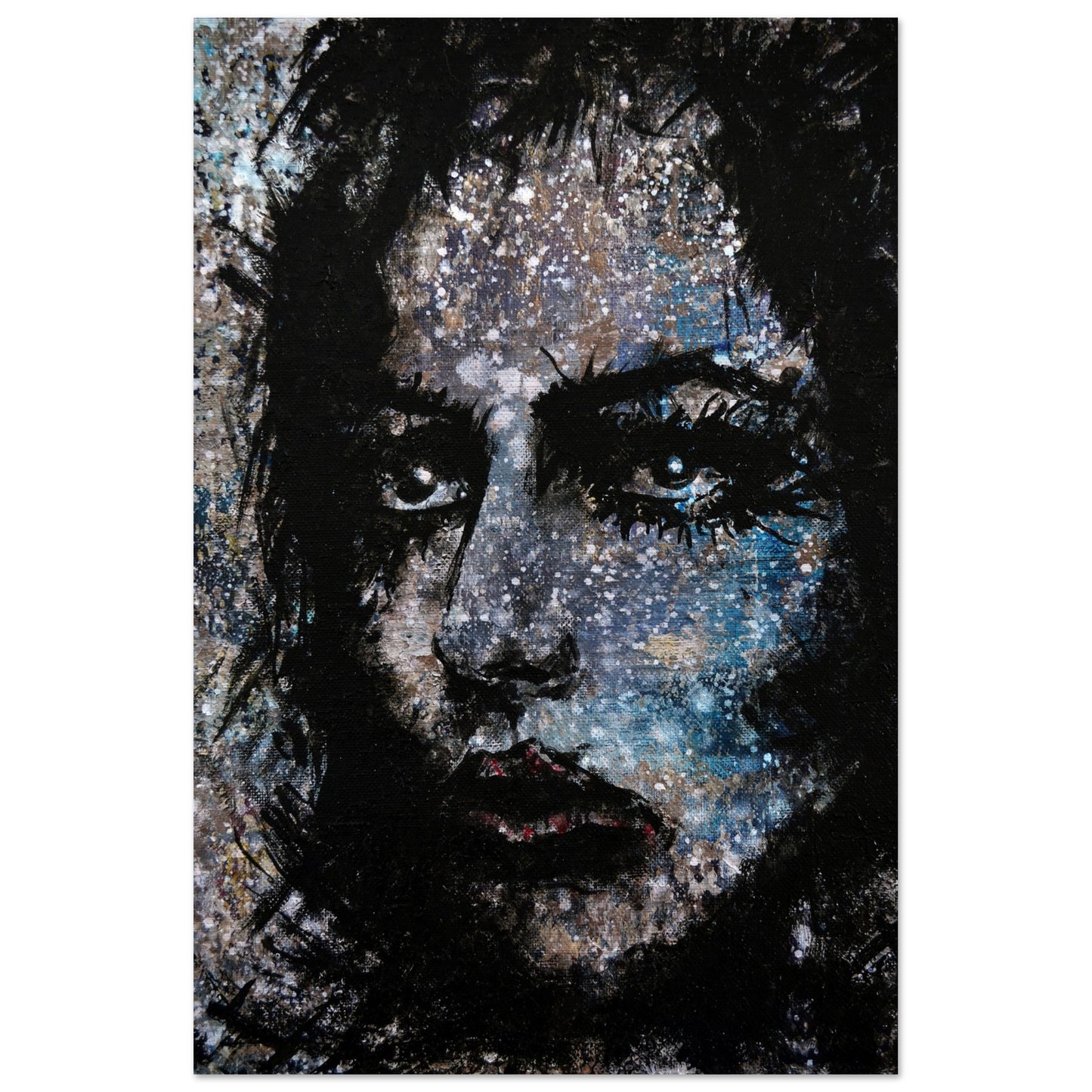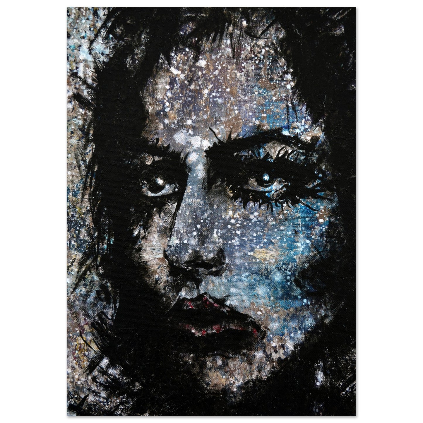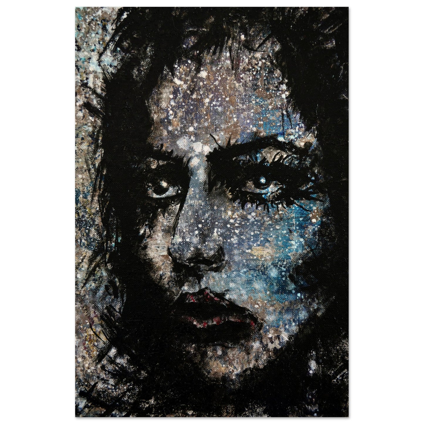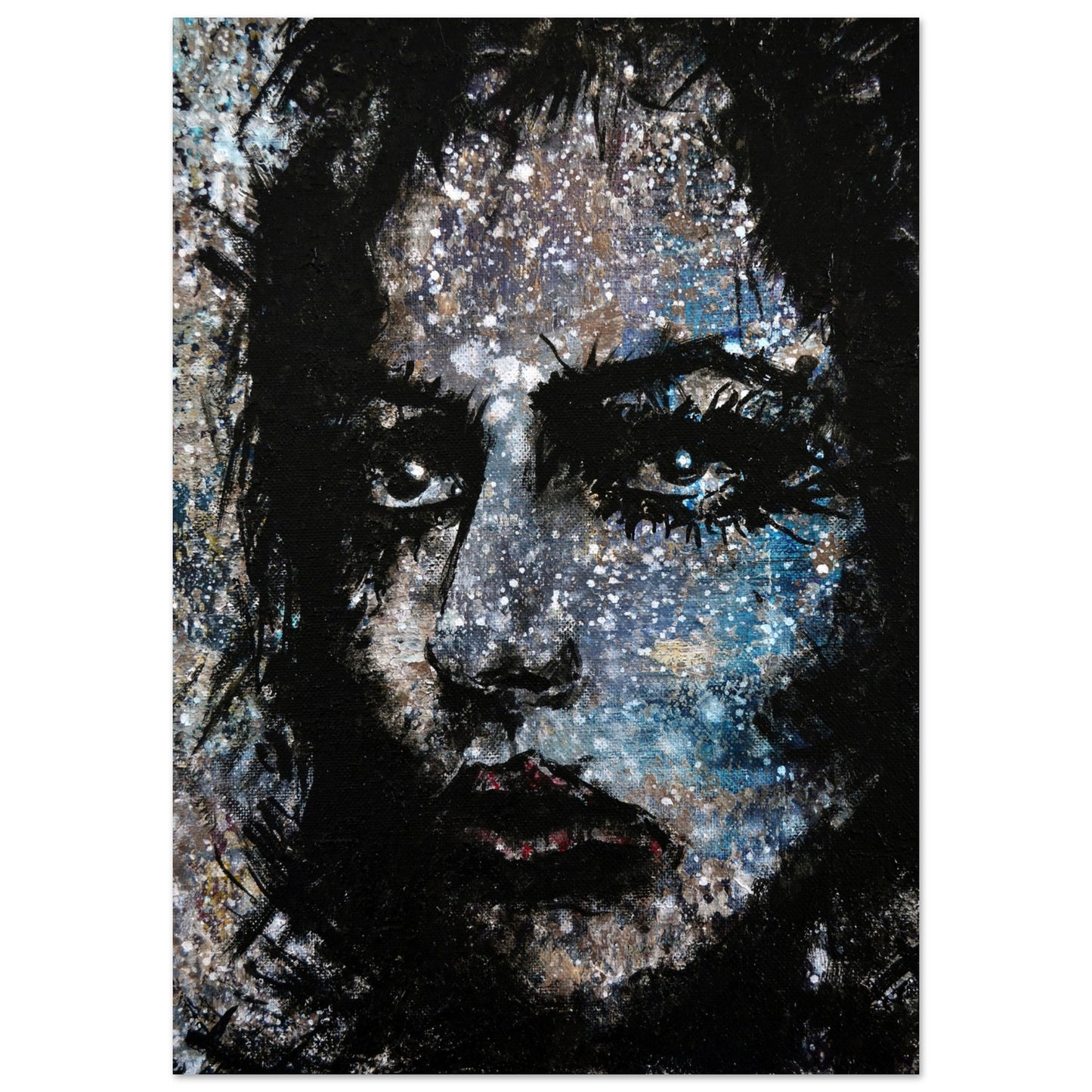 Explore the mesmerizing world of 'Sweet Frugality,' an abstract art capturing the essence of a woman in a unique artistic vision. The black-painted facial features exhibit bold brushstrokes against a serene grayish-blue backdrop, reminiscent of a distant galaxy adorned with the hues of bright whites and blues resembling a cosmic landscape.