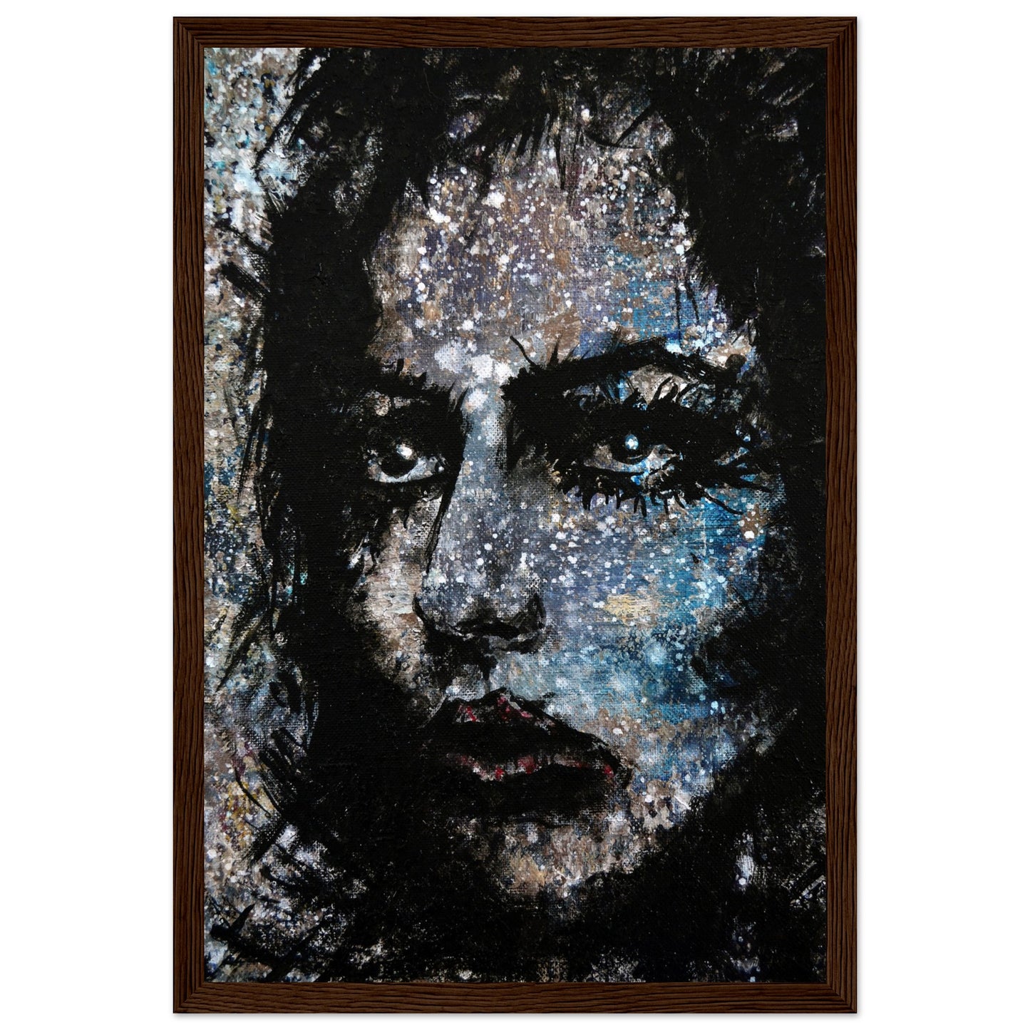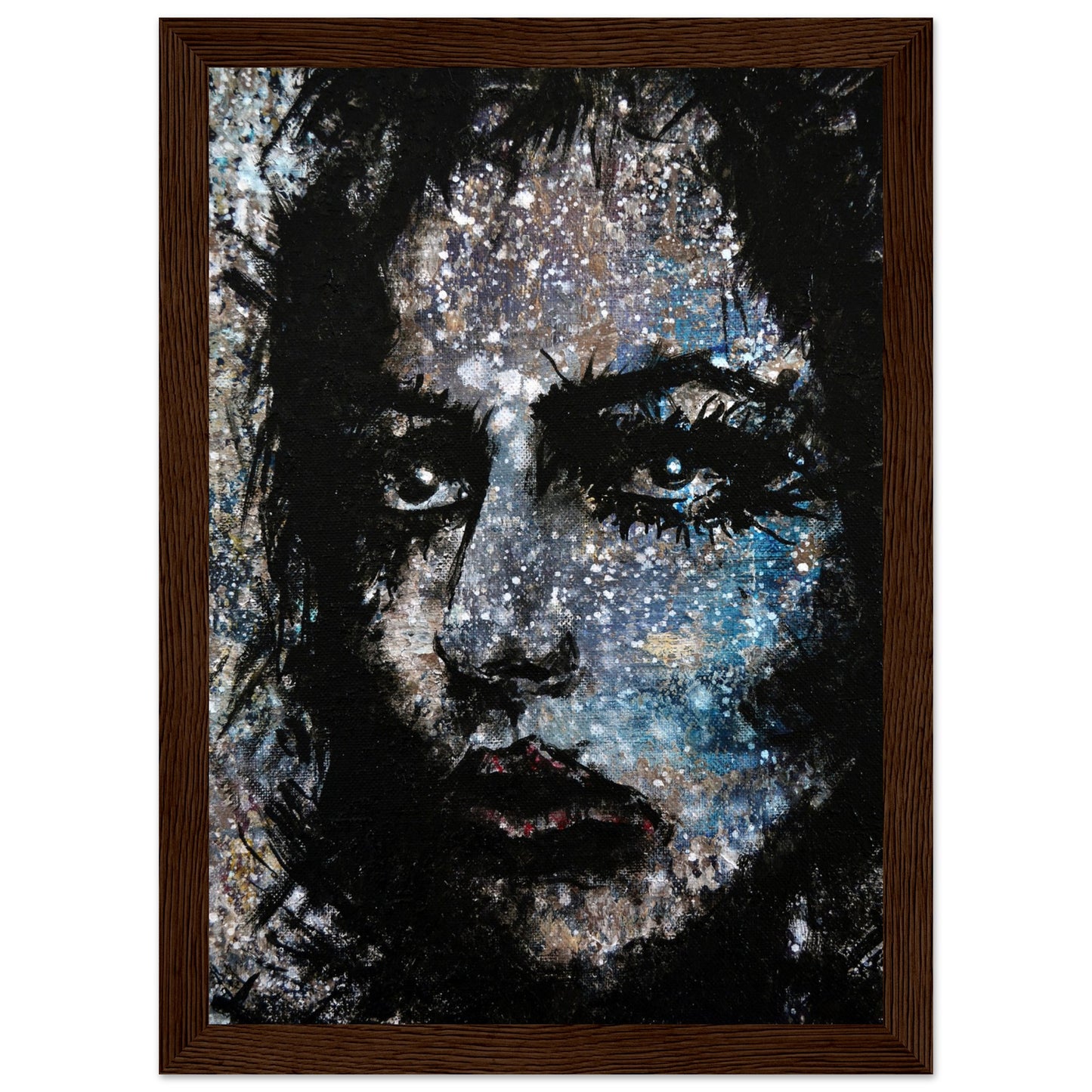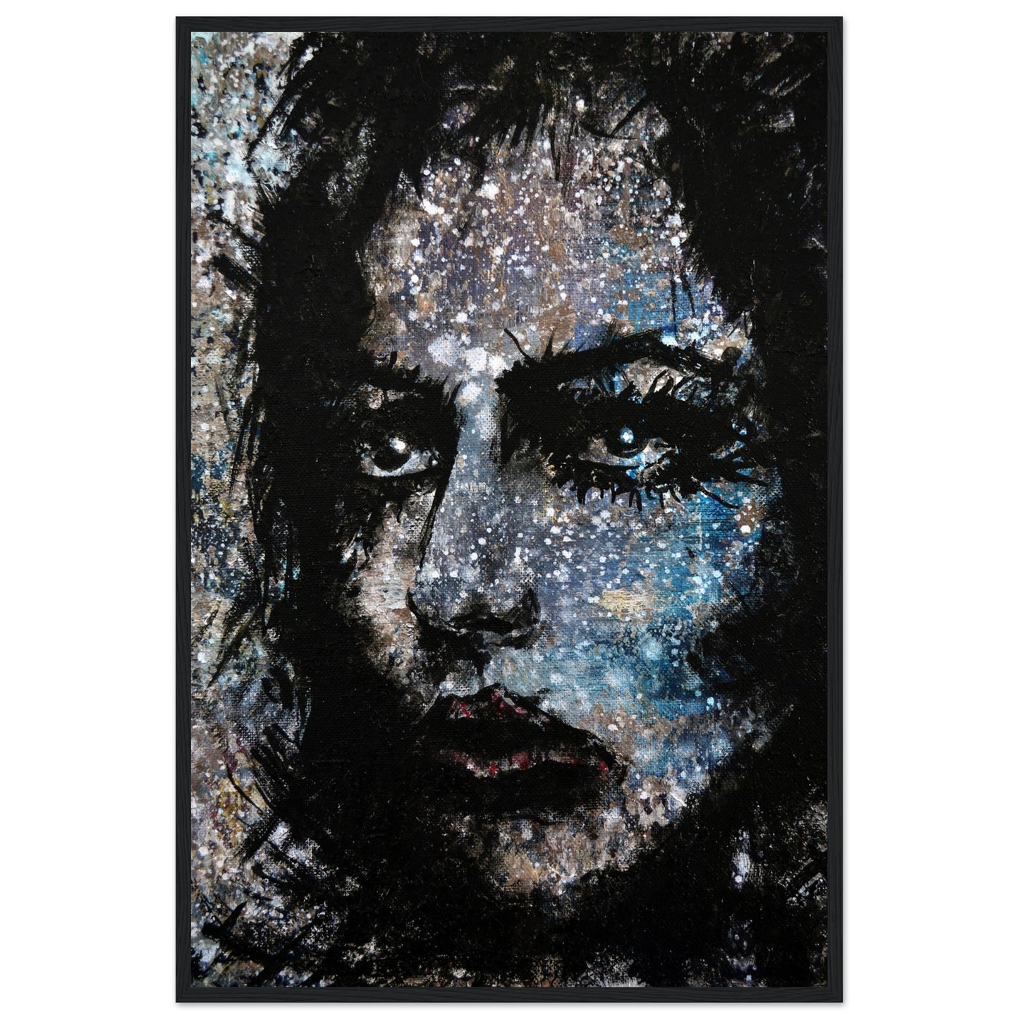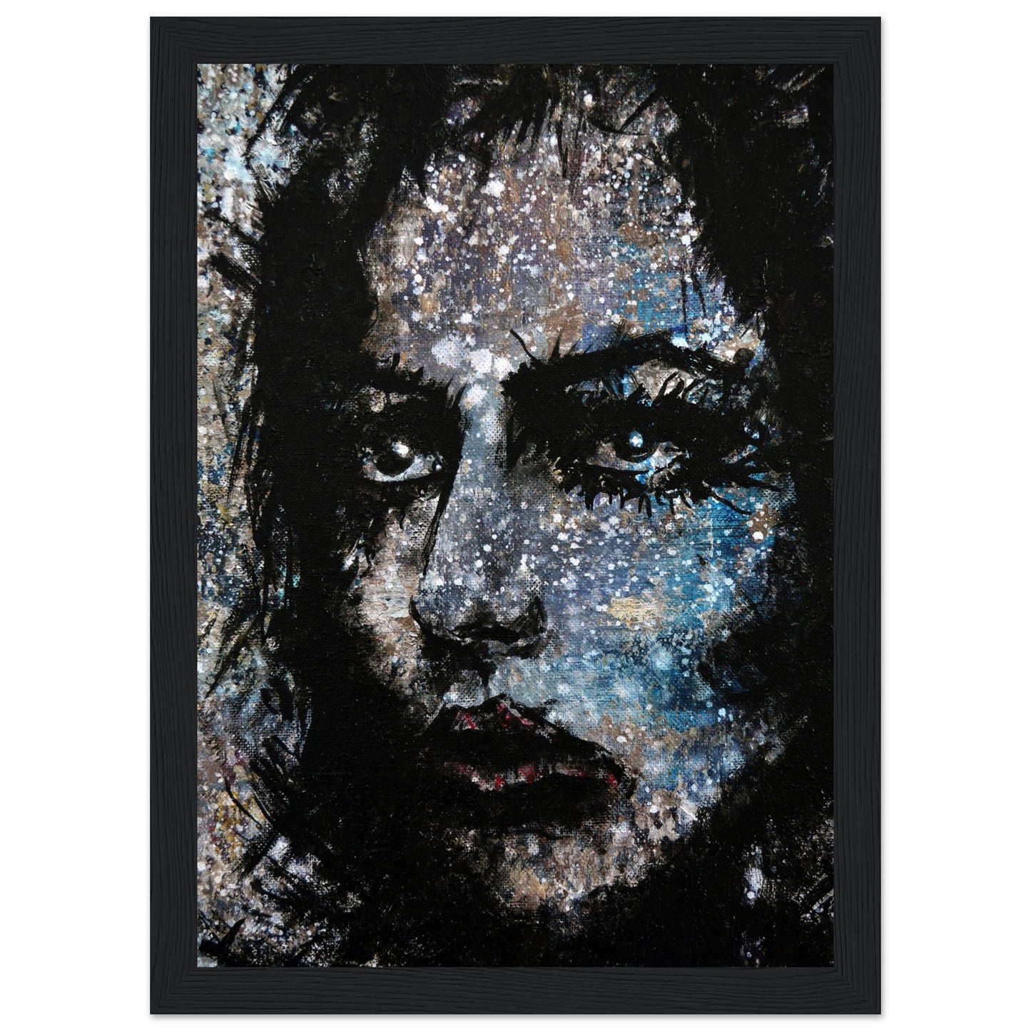 Explore the mesmerizing world of 'Sweet Frugality,' an abstract art capturing the essence of a woman in a unique artistic vision. The black-painted facial features exhibit bold brushstrokes against a serene grayish-blue backdrop, reminiscent of a distant galaxy adorned with the hues of bright whites and blues resembling a cosmic landscape.