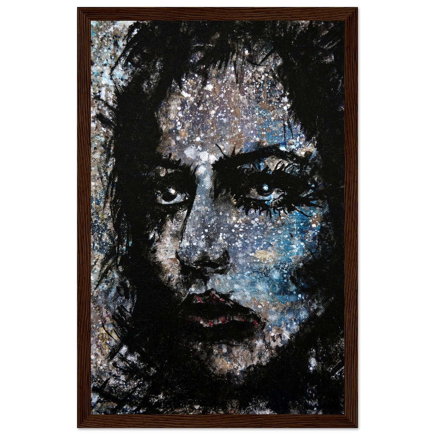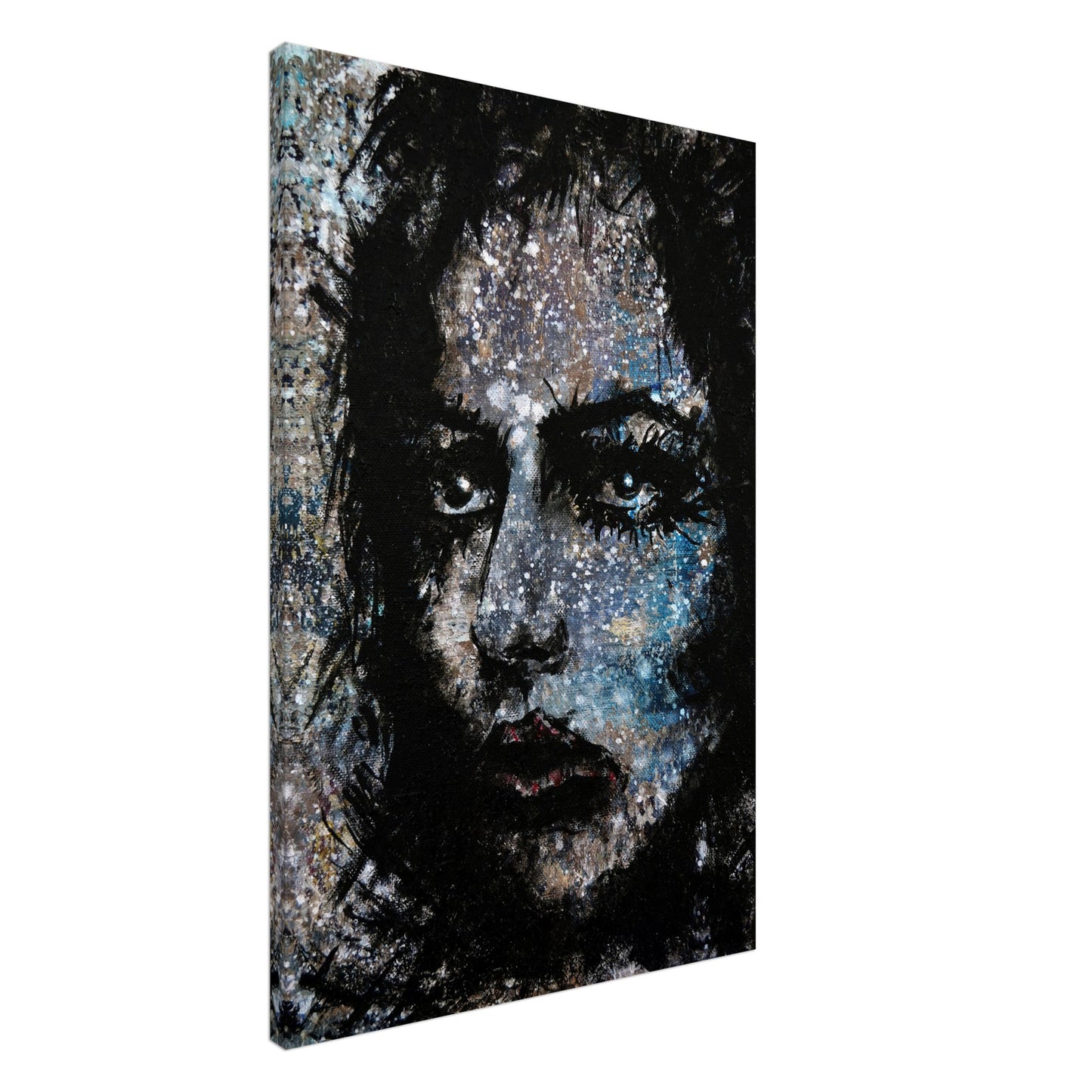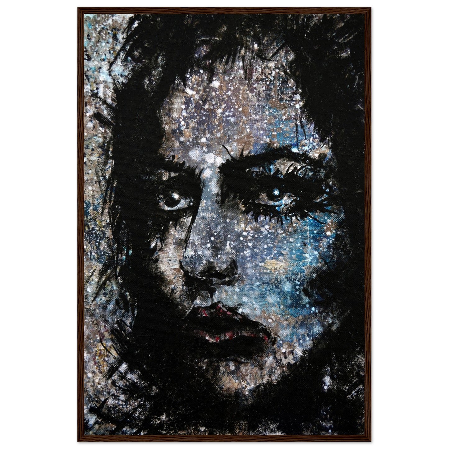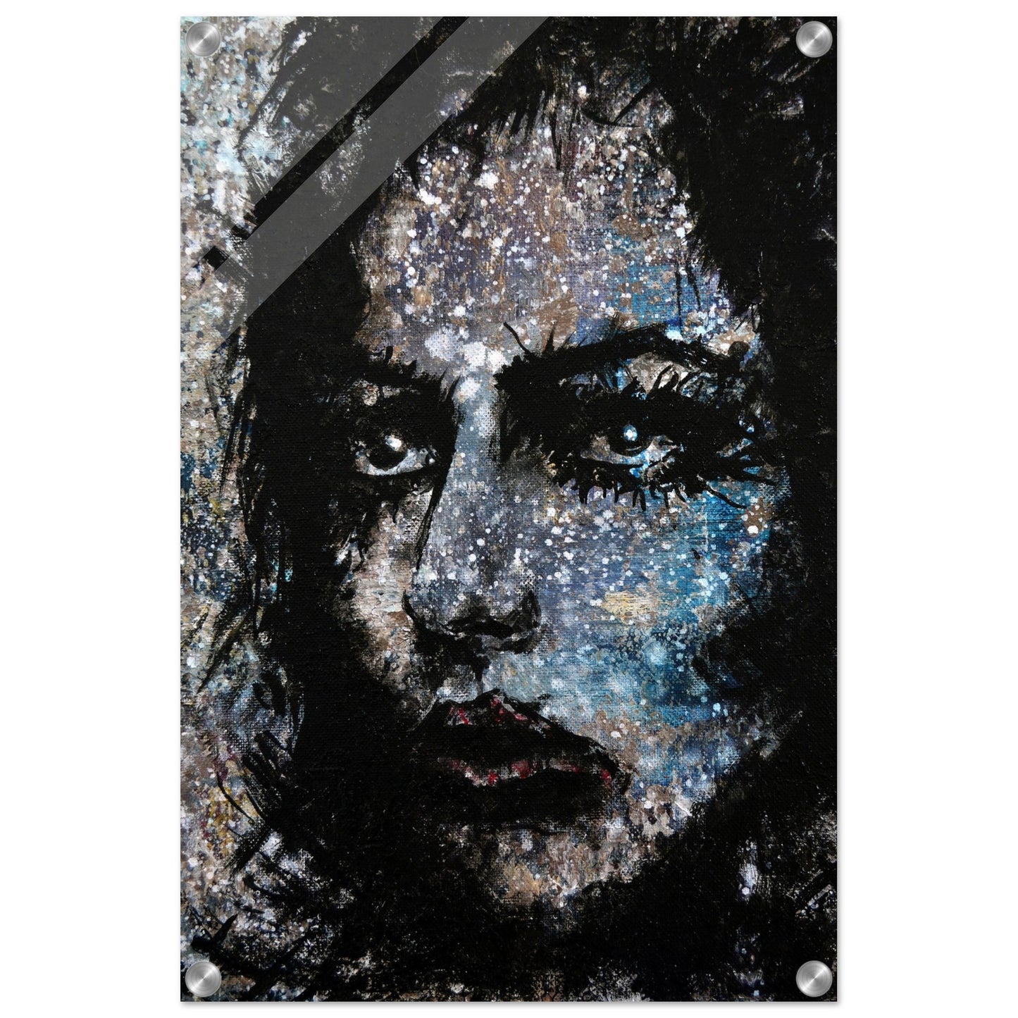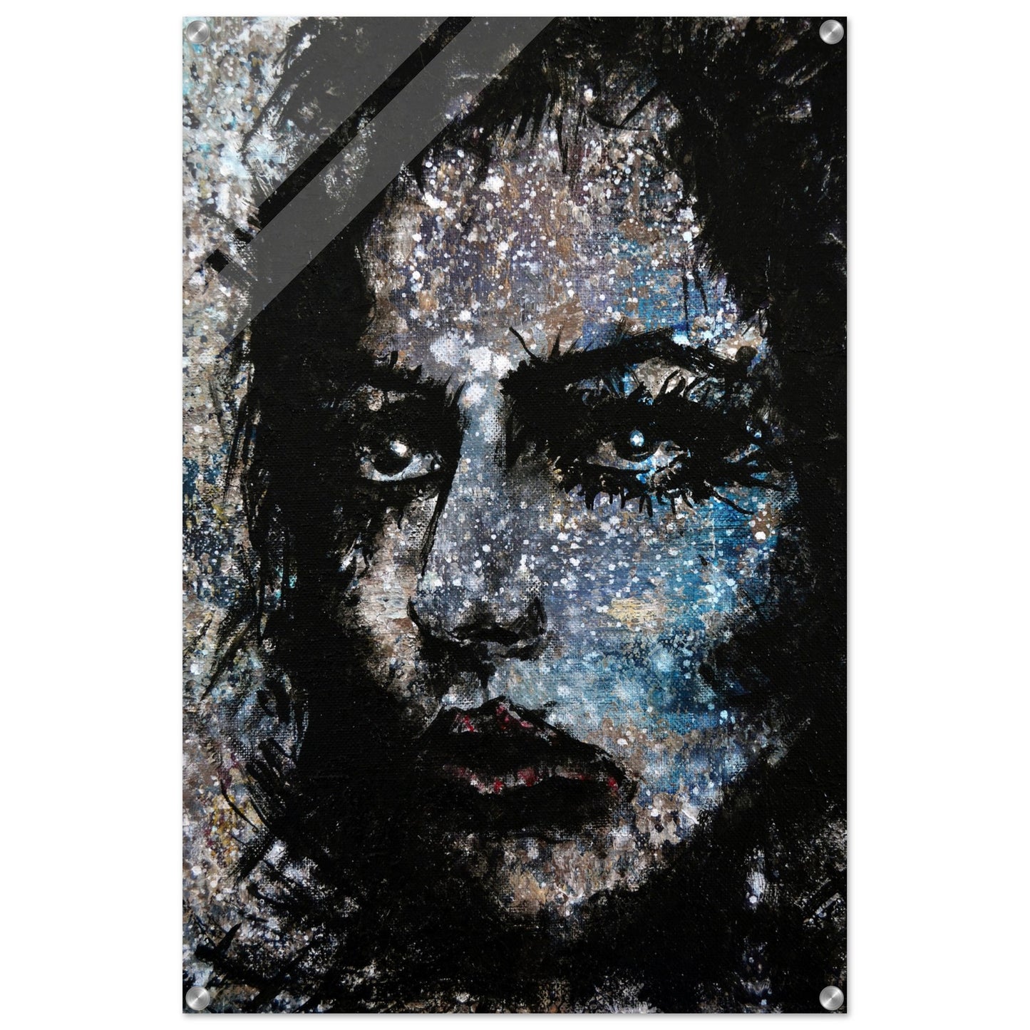 Explore the mesmerizing world of 'Sweet Frugality,' an abstract art capturing the essence of a woman in a unique artistic vision. The black-painted facial features exhibit bold brushstrokes against a serene grayish-blue backdrop, reminiscent of a distant galaxy adorned with the hues of bright whites and blues resembling a cosmic landscape.