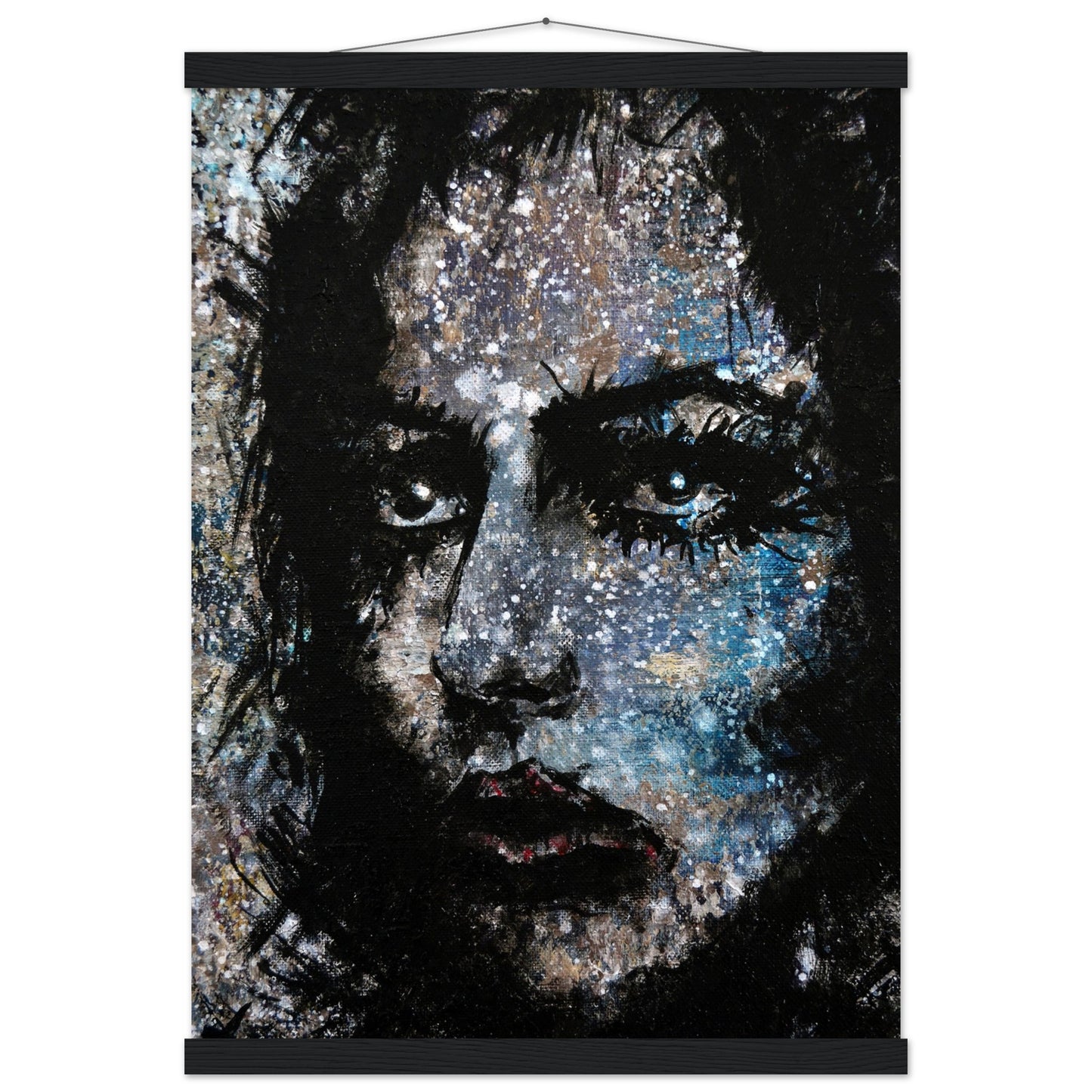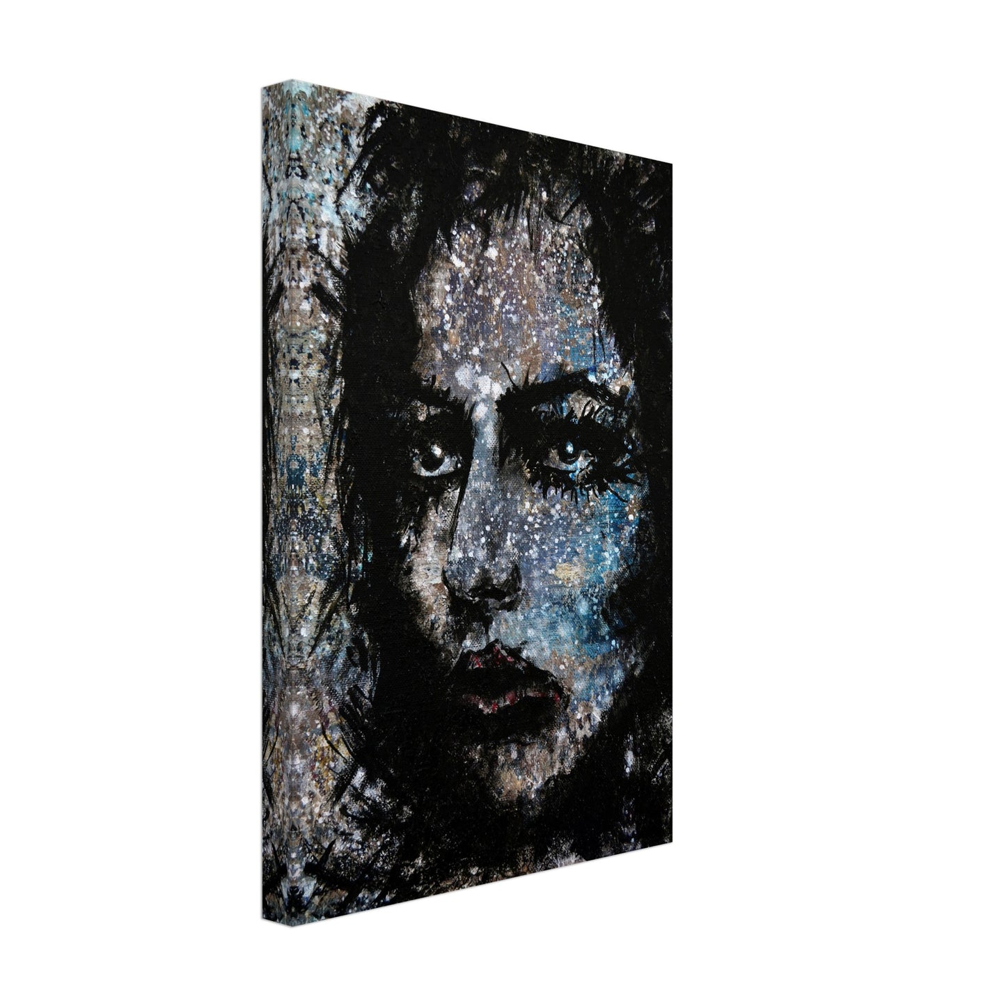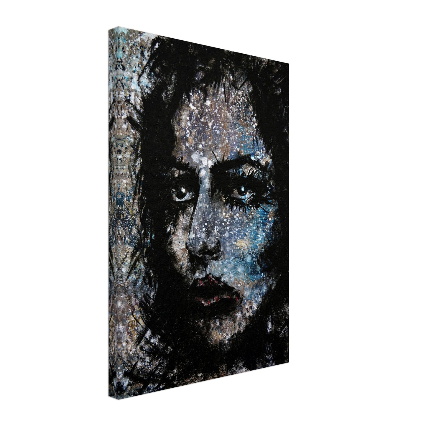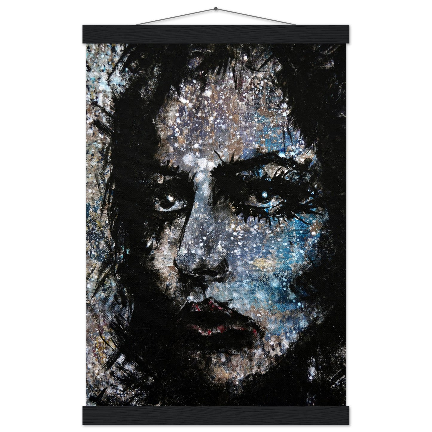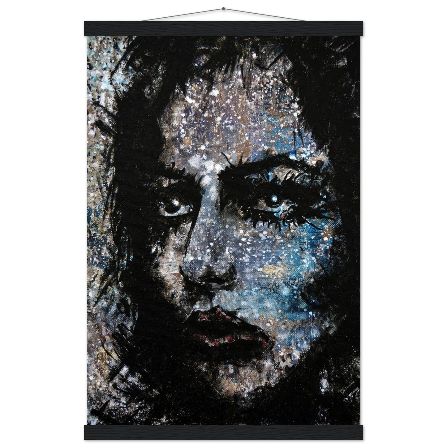 Explore the mesmerizing world of 'Sweet Frugality,' an abstract art capturing the essence of a woman in a unique artistic vision. The black-painted facial features exhibit bold brushstrokes against a serene grayish-blue backdrop, reminiscent of a distant galaxy adorned with the hues of bright whites and blues resembling a cosmic landscape.