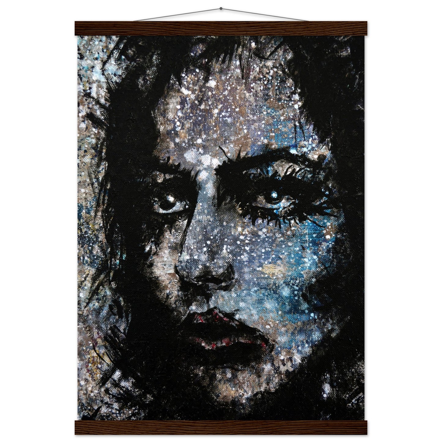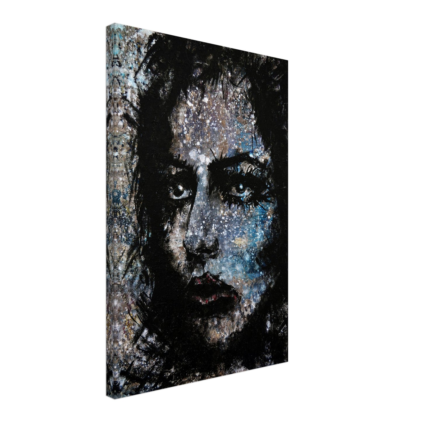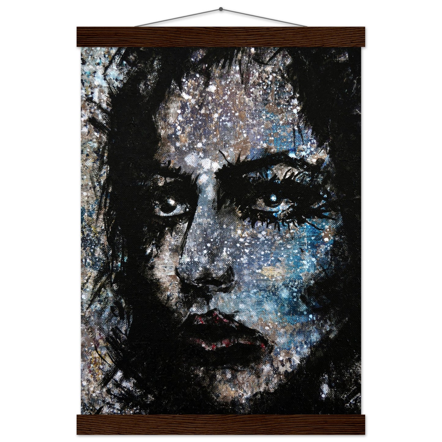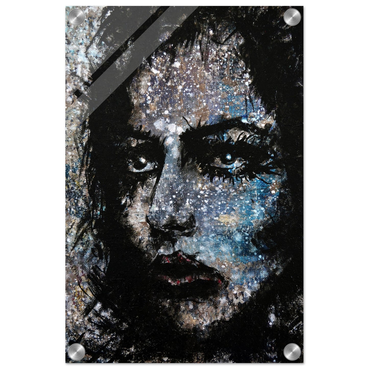 Explore the mesmerizing world of 'Sweet Frugality,' an abstract art capturing the essence of a woman in a unique artistic vision. The black-painted facial features exhibit bold brushstrokes against a serene grayish-blue backdrop, reminiscent of a distant galaxy adorned with the hues of bright whites and blues resembling a cosmic landscape.