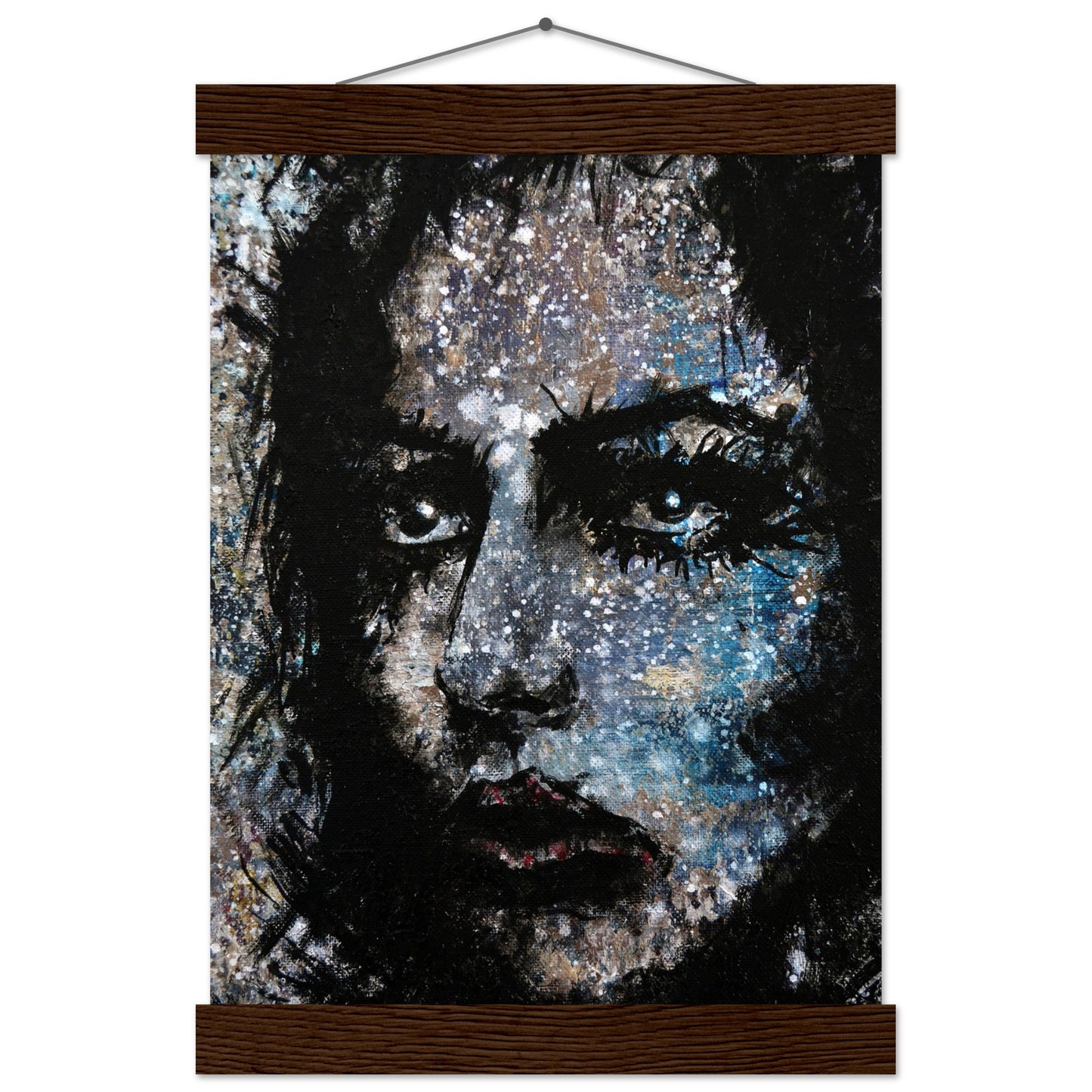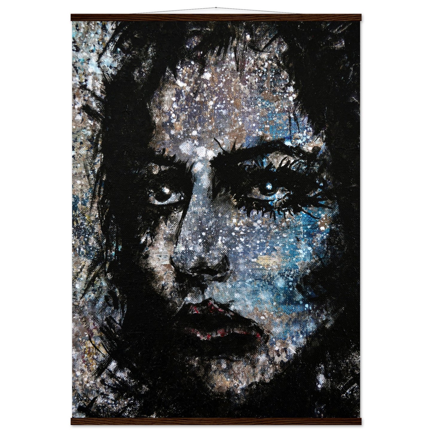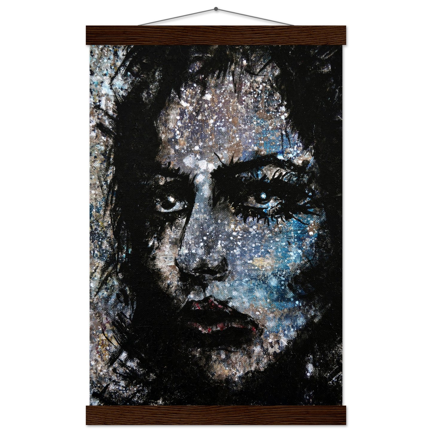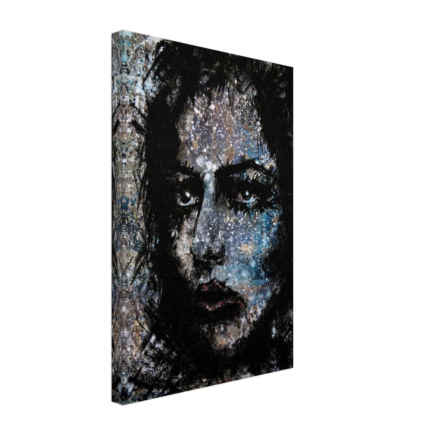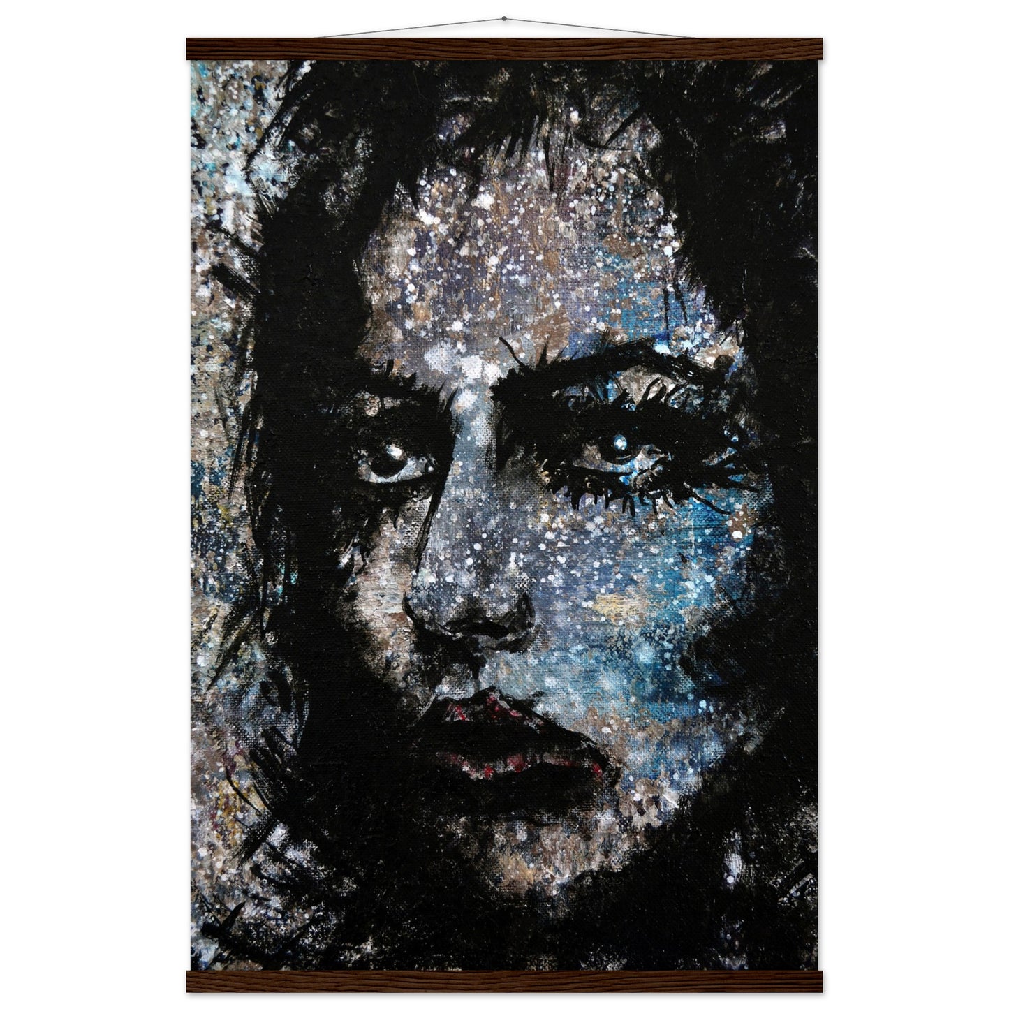 Explore the mesmerizing world of 'Sweet Frugality,' an abstract art capturing the essence of a woman in a unique artistic vision. The black-painted facial features exhibit bold brushstrokes against a serene grayish-blue backdrop, reminiscent of a distant galaxy adorned with the hues of bright whites and blues resembling a cosmic landscape.