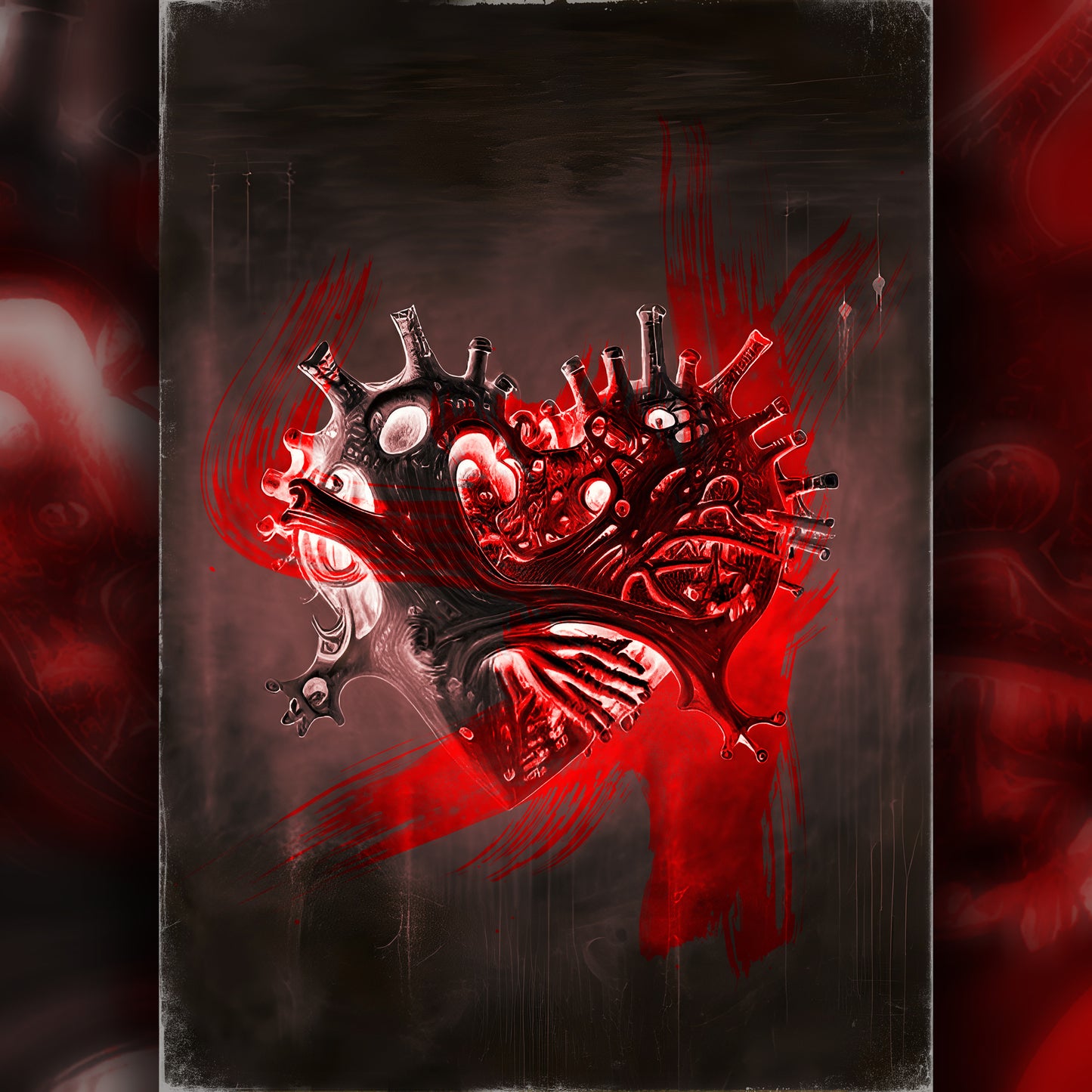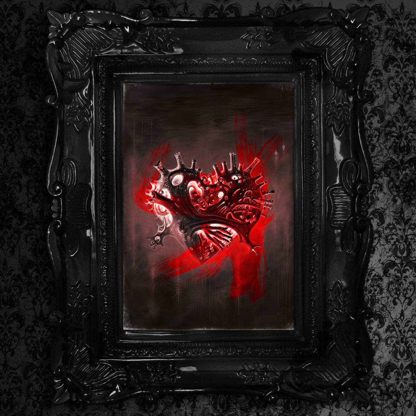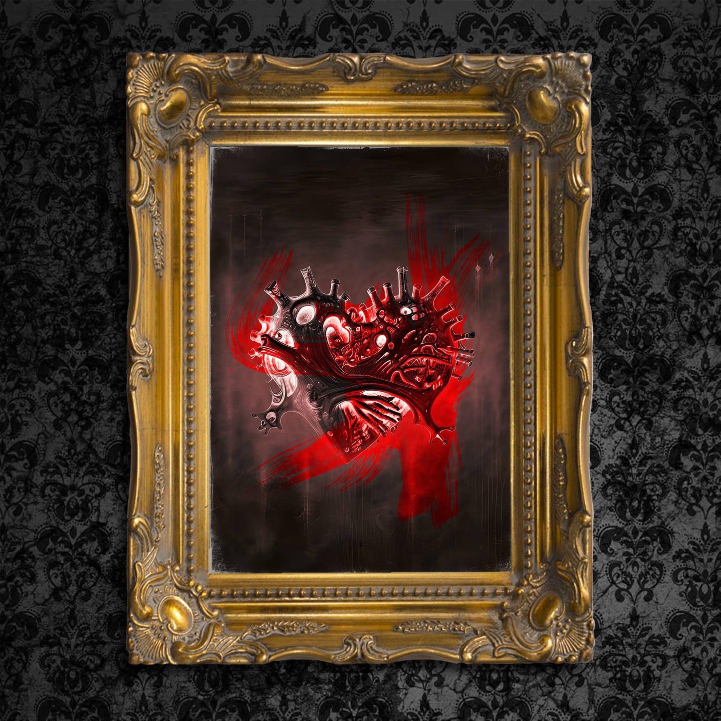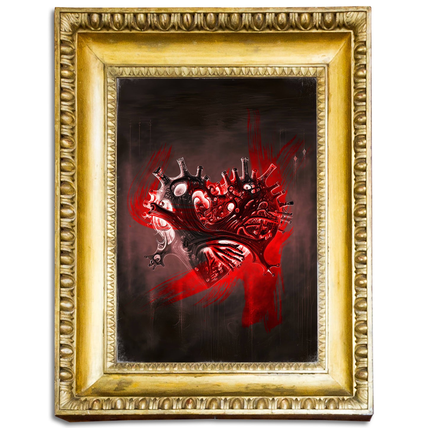 "Bizarre Love" is a limited edition Giclée print that offers a unique take on the classic symbol of love. The artwork portrays a traditional heart but with veins extending outward, reminiscent of a real heart. It takes on a stylized look akin to an X-ray photograph on an aged, worn negative. Across the heart, large brushstrokes of red paint evoke a sense of intensity and passion, giving the piece a gore-horror ambience. This work is a distinctive blend of romance and macabre, inviting viewers to explore the intricacies of love in an unconventional and captivating manner.