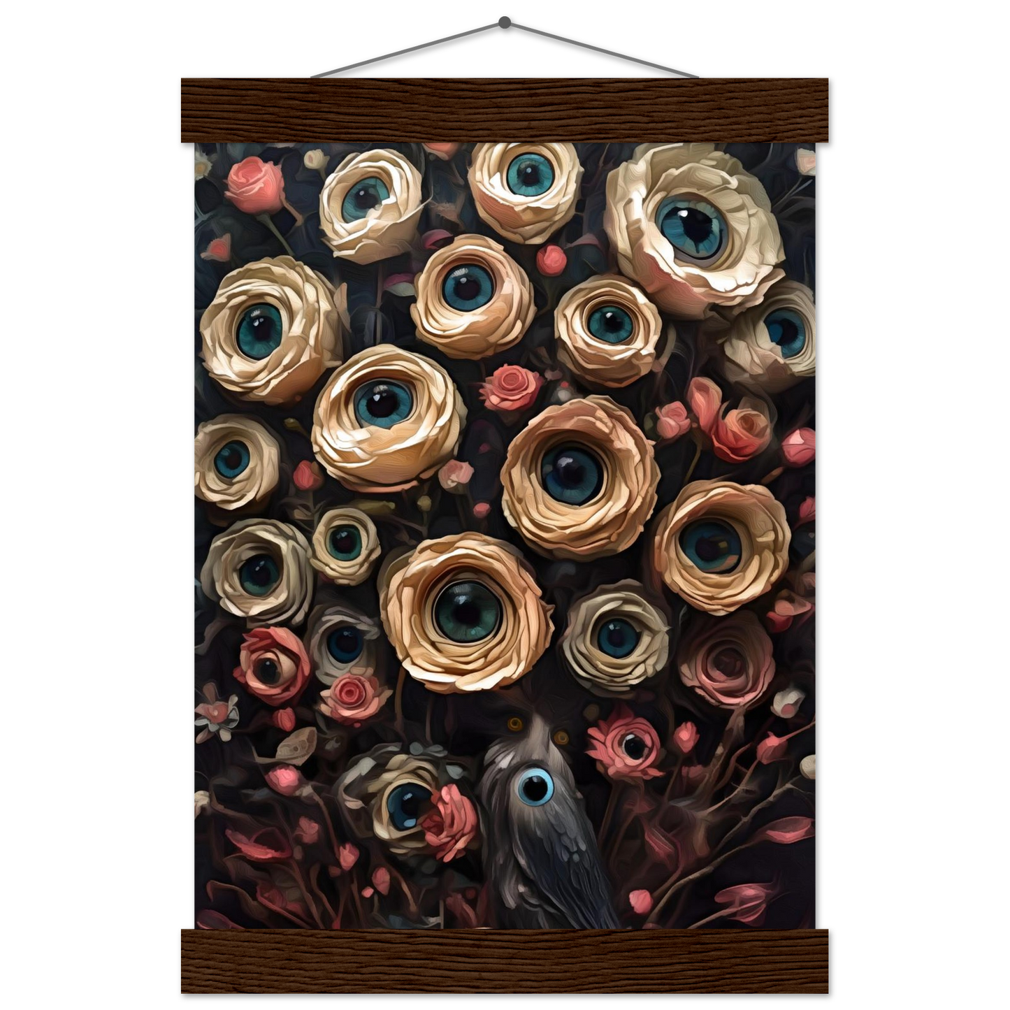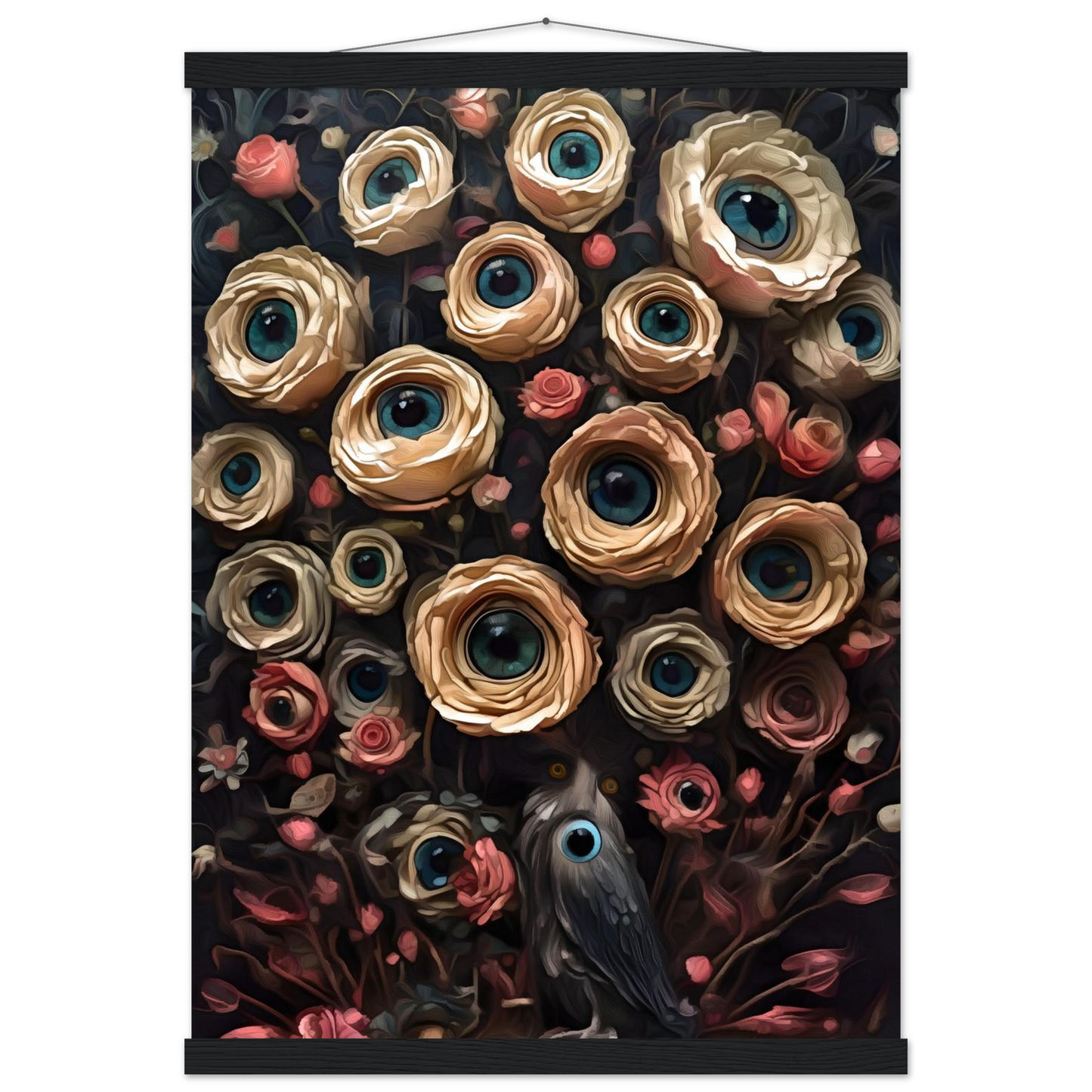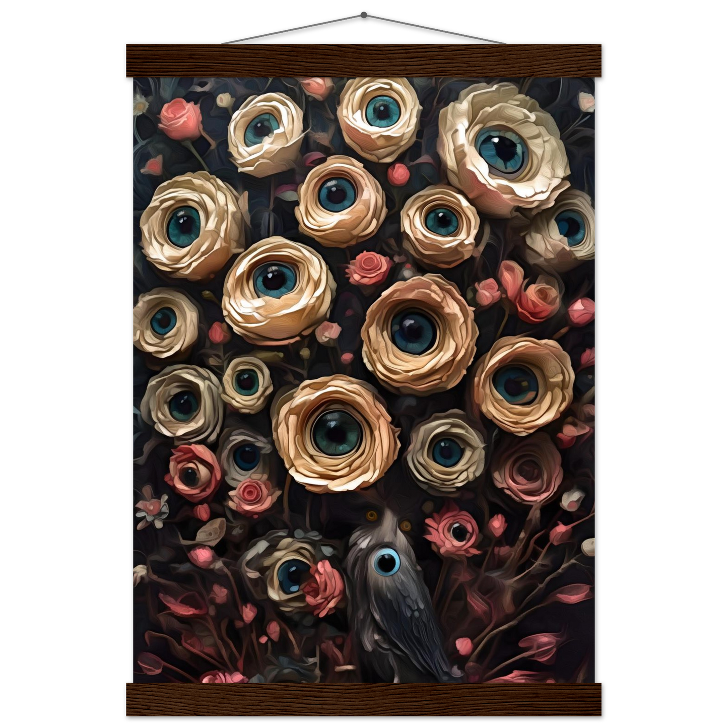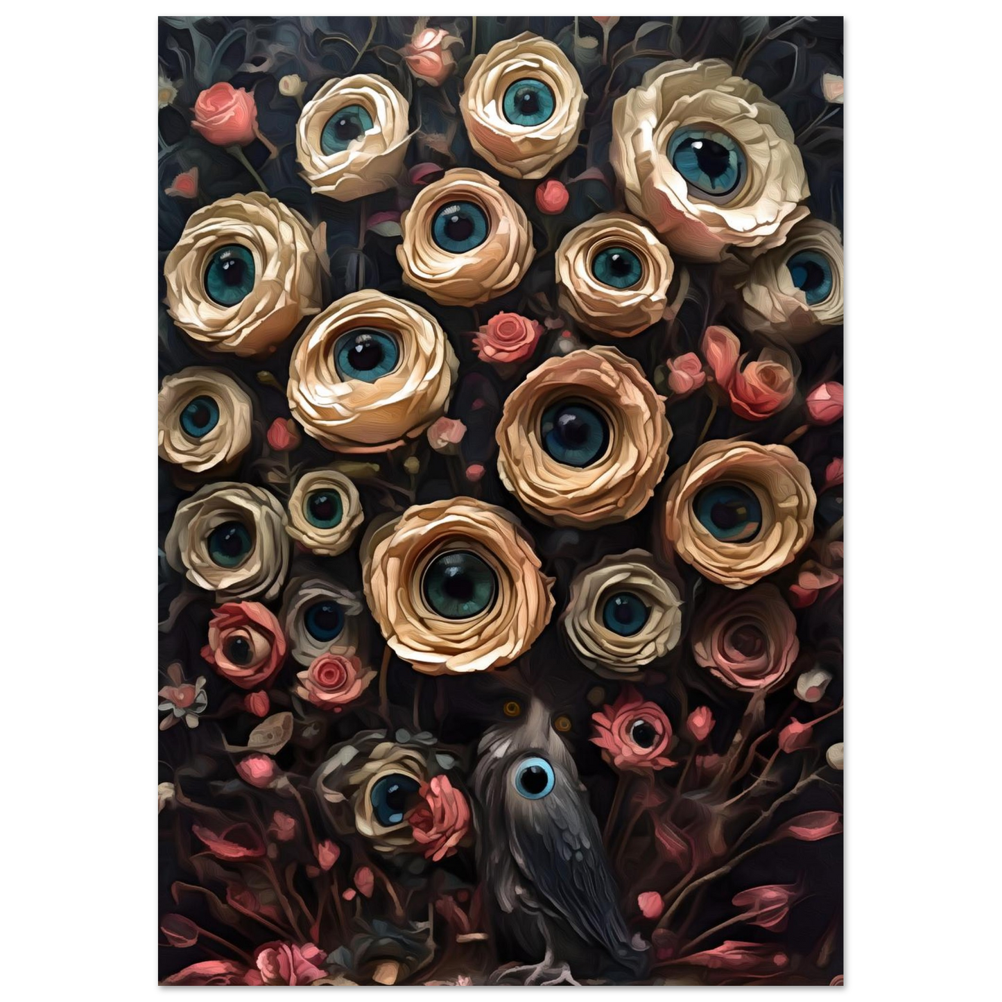 "Flowers Dusk" is a hauntingly beautiful digital artwork that merges floral elegance with surreal mystery. Each flower in the composition holds a watchful eye at its center, framed by delicate, shadow-kissed petals. The palette is moody and subdued, evoking twilight and secrecy—like stepping into a dream where nature observes you back.