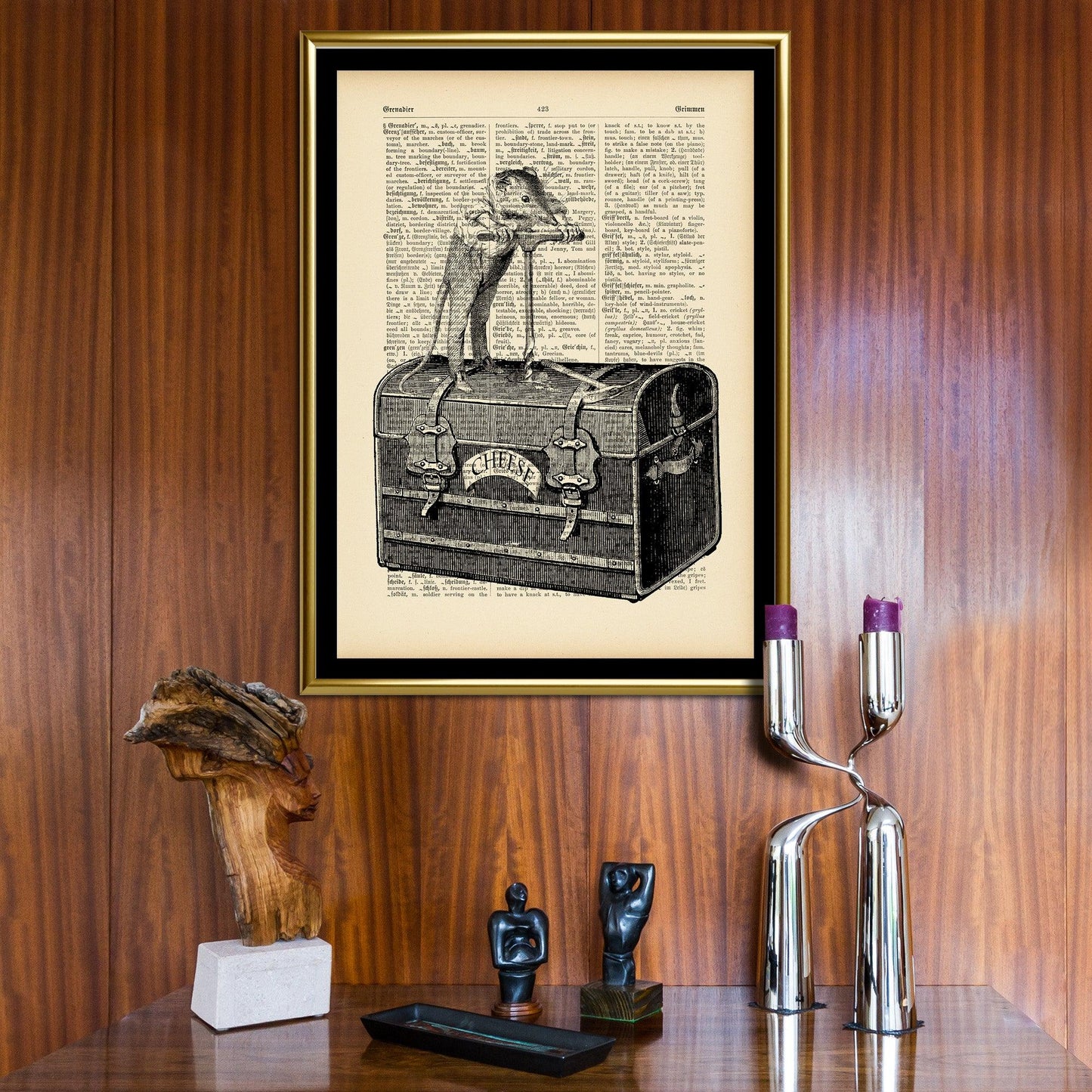 "Mouse Treasure - Literary Poster Gift" is a delightful piece of fantasy art. Printed on a real vintage page, this modern poster gift captures the essence of Victorian art. The whimsical image features a mouse and a piece of cheese, adding a touch of humour to your space. Perfect for animal lovers and those who appreciate the unique literary-inspired decor.